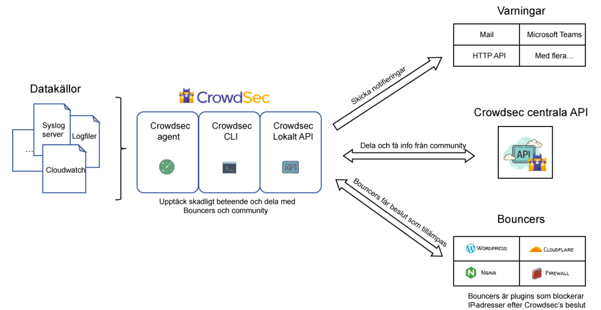 En av CrowdSecs största styrkor jämfört med andra lösningar är dess community-drivna modell: metadata om upptäckta attacker (käll-IP, tidpunkt och utlöst scenario) skickas till ett centralt API och delas med alla användare.
